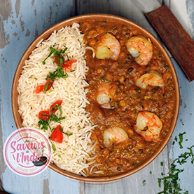 Crevettes, assortiment de lentilles, sauce curry. Servi avec un bol de riz.